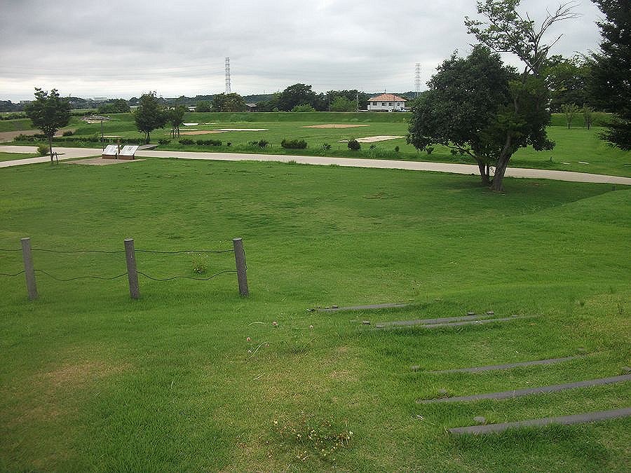 同じく展望台から西方向を。オレンジ色の屋根の民家は土塁から60mほど離れており、更に外側に外堀を兼ねた小川が流れている。