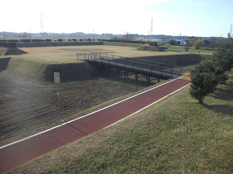 南東の展望台から土塁の上を西へ、サイクリング道路の先に馬出し (虎口の外側を守る曲輪) 部分が見える。