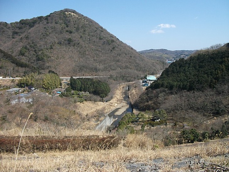ダムの下流。正面は城山、山裾に中伊豆バイパス、山の右手に「城の平」の地名がある。