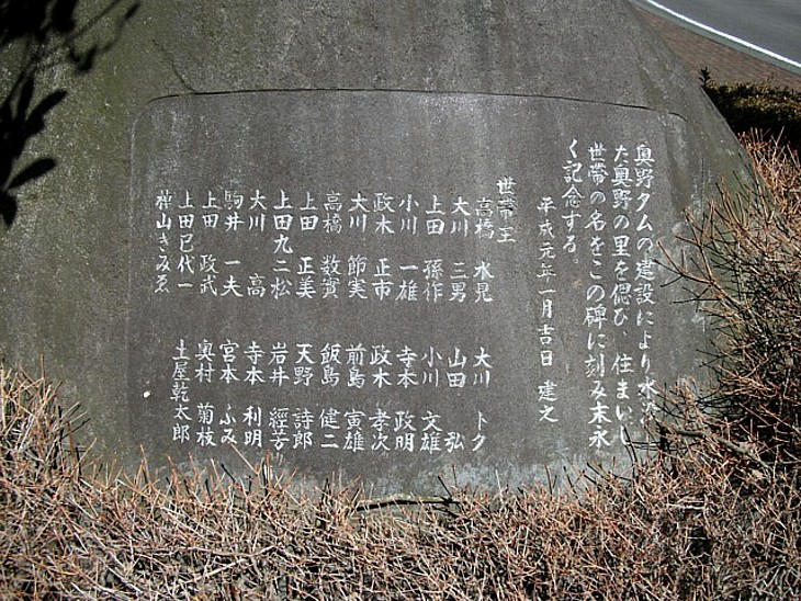 石碑の裏側に刻まれた水没27軒の所帯主。ダムが完成してから2011年で22年が過ぎた。