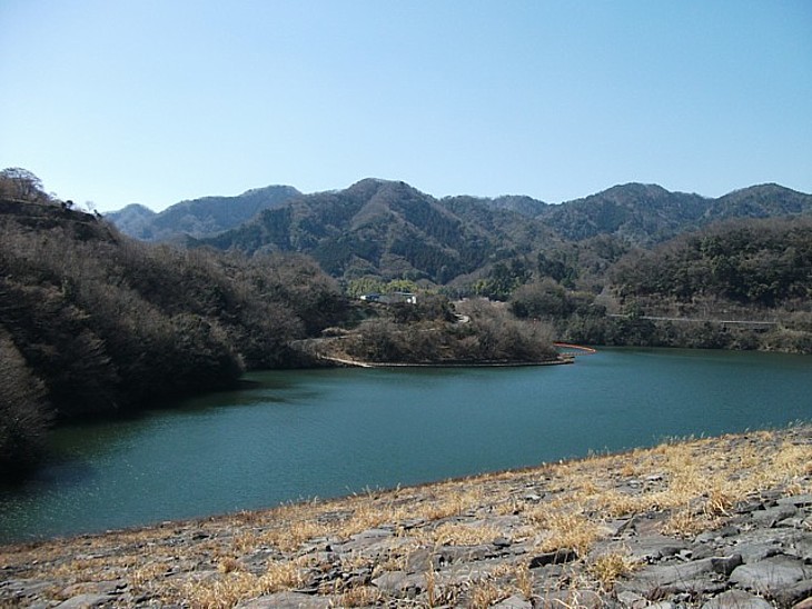 上流方向には中伊豆を隔てる山並み、中央の岬には奥野ダム資料館(無料)が建つ。