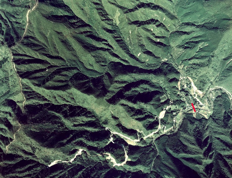 赤線が現在のダム、その左側に建設中のバイパス一帯で巻き狩りが行われた。