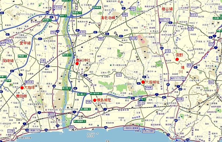 大庭御厨周辺の地図。東端の境川(俣野川)から西端の相模川(西岸を含む?)まで大庭御厨だったらしい。