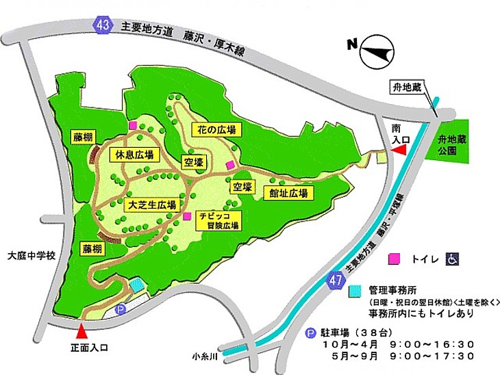 県道43号の上(東)を流れる引地川の周辺にも親水公園と広い駐車場を備えている。