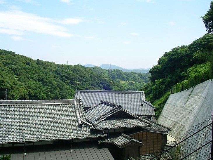 法性寺の裏手から仮想敵の三浦領・逗子駅の方角を見る。正面は双子山(208m)か。