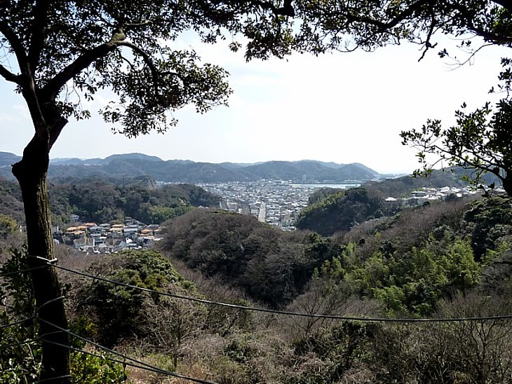 大切岸の崖上から。中央に横須賀線と、小坪随道を下って市街地に入る旧国道が見える。