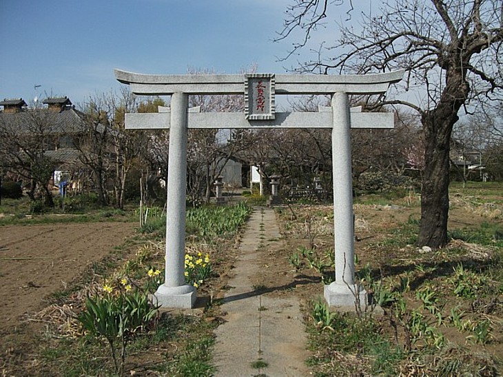 大蔵館跡から300m西の農地に石碑があり、奥に続く参道突き当りが義賢の廟所となる。