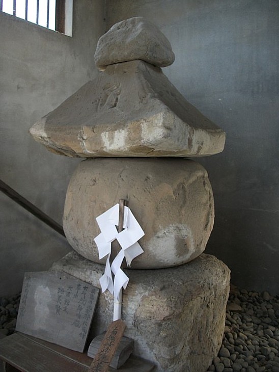 火輪(笠部分)と水輪(丸い部分)のみ。数度の火災を経て破損した痕跡が残されている。