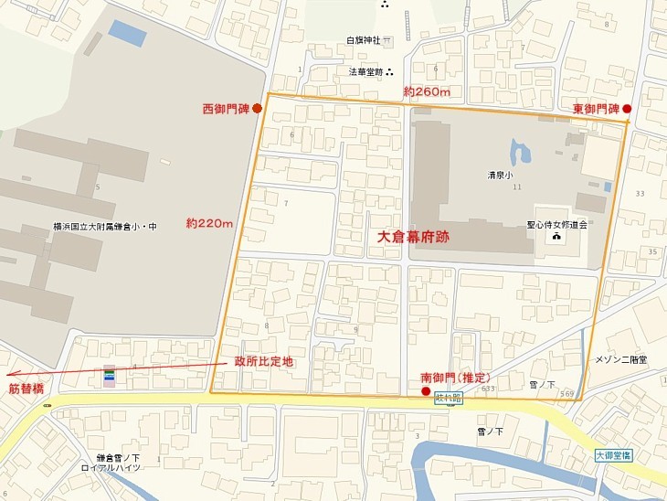 大倉幕府跡の拡大図。発掘調査により東西260m×南北220mの敷地が確認された。