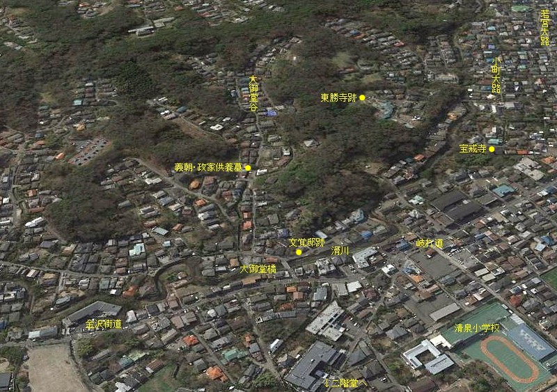 北の荏柄天神社方向から見た雪ノ下五丁目の鳥瞰。政子を葬った大御堂寺の谷津である。