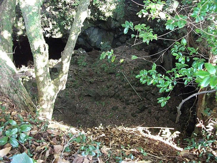 洞窟は直径24m・最深部15m、横方向は落盤で不明。富士山樹海の人穴に繋がる、とも。