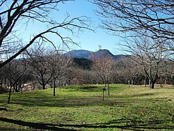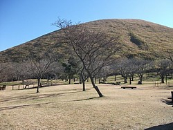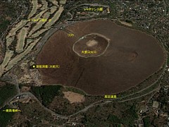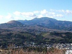 左: 大室山西側の「さくらの里」駐車場からの遠景。良く整備された公園で、40種・3000本の桜が植えてあり四季を通じて花を楽しめる。