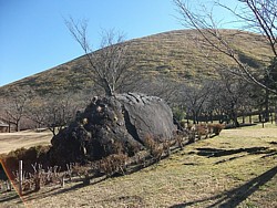 中: 熔岩洞窟部分の遠景。3700年前に大室山が噴火し、地下に空洞を残したまま地表を覆った熔岩が固まり、やがて地表部分が陥没して洞窟に
