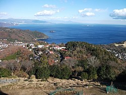 中央のやや右に見える三角は伊勢原の大山、左奥の岬の陰に白く見えるのは熱海市街地。