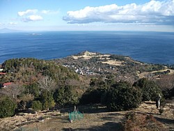 中: 頂上の展望台から北方向を。岬の先に見えるのは1989年の海底噴火で市街地のすぐ前に出現した手石島、右手に浮かぶのは初島、
