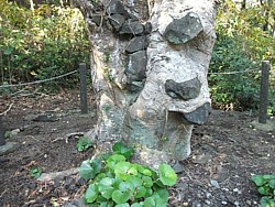 中: こちらは遊歩道の途中にある「石喰いのモチノキ」。成長する過程で石を抱え込んだのだろう。最近流行の「根性なんとか」の仲間だね。