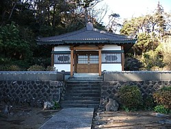 左: 俎岩手前の入江に建つ蓮着寺奥の院。波を避けて和船が入れる砂利の浜で、鎌倉から流された日蓮がここに上陸した可能性はある、ような気がする。