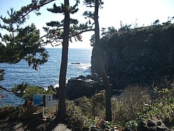 中: 少し怖いけど崖上の「灯明台」(古式の灯台か宗教施設か不明)の縁から身を乗り出して俎岩を眼下に覗く。ここに船を着け囚人を降ろすくらいなら