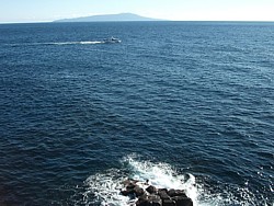 右: 遊覧船が視界を横切るシャッター・チャンス、水平線には伊豆大島が浮かんでいる。直線で約20km、本土からの距離はここからが最も短い。