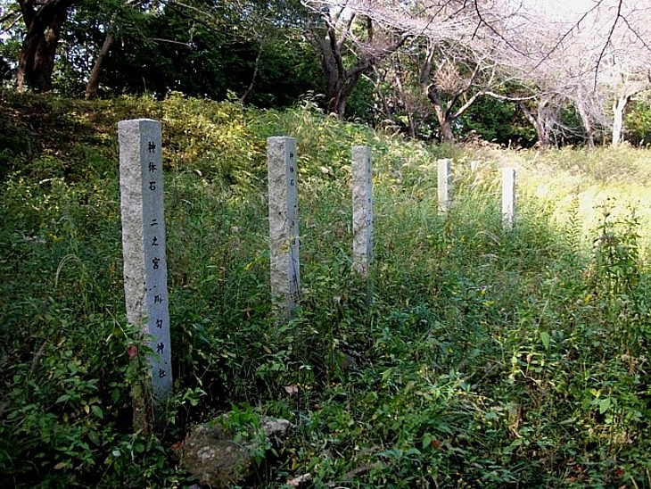 五社と総社(六所神社)の神が鎮座する神体石(根元の石)。神官が鉾・榊・御幣を奉拝する。