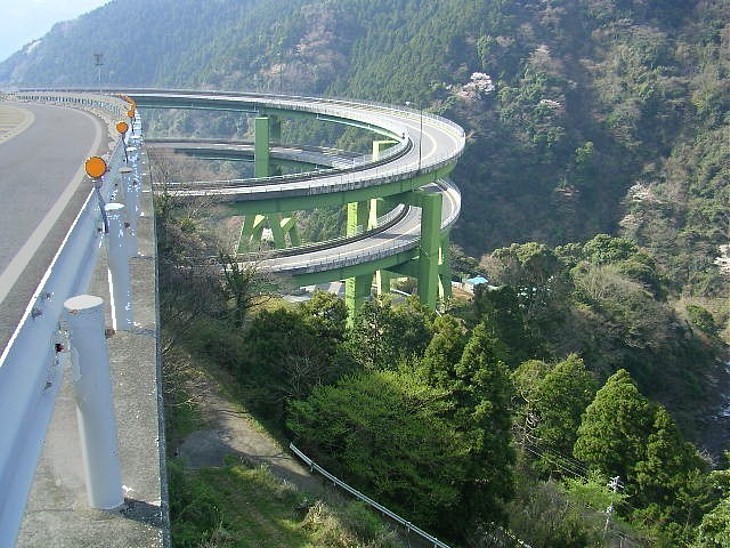 天城峠の南麓を一気に下る河津ループ橋。すぐ下には湯ヶ野温泉の旅館が点在する。