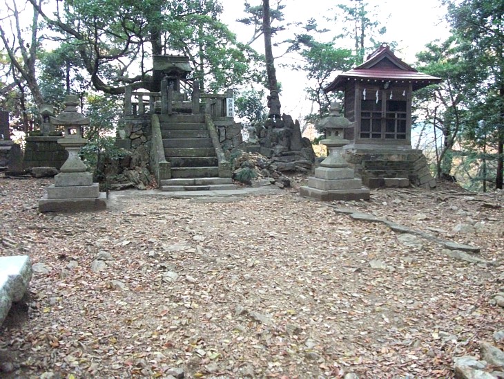 約30m四方ほどの山頂部分には神社の他に小さな祠が数ヶ所、ここが両崖山城址の本郭部分。