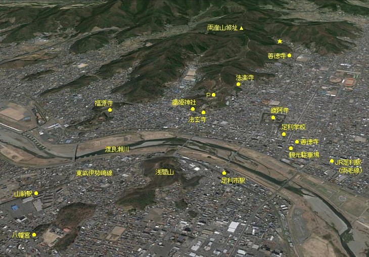 両崖山から義家所縁の八幡宮までの鳥瞰。「P」から往復する予定が道に迷って善徳寺の北(