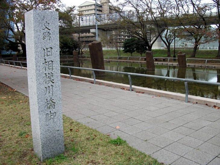 現在の橋脚は樹脂製レプリカ。調査済みの丸太や護岸材は埋め戻して劣化を防いでいる。