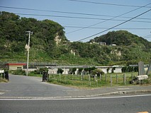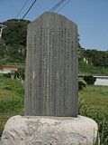 中: 当時と地形は当時から変わっているが、顕彰碑の背後に見える鞍部の付近から稲村路が斜面を下っていたと推定される。
