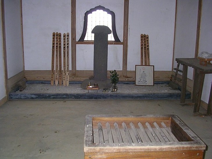 堂内部の墓標。刻まれた文字が微かに読めるが風化しているため内容が判らない。