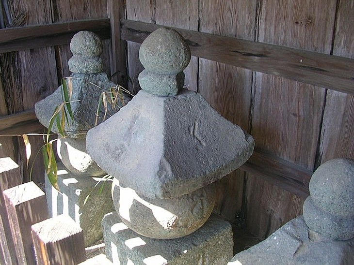 覆屋で保護された廟所。寺伝に拠れば、五輪塔は頼朝建立の義朝・義平・朝長の供養墓としている。
