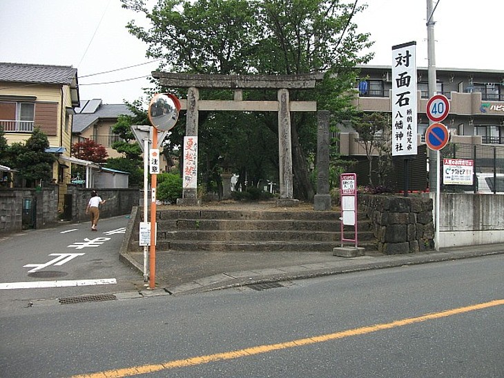 八幡神社一の鳥居は旧東海道に面し、一段高い参道が二の鳥居まで120m続いている。