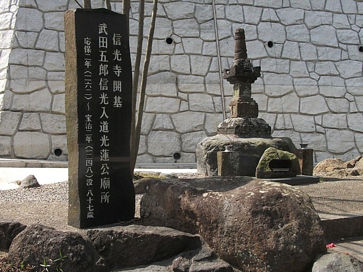 石碑と信光供養墓。本来の菩提寺は北杜市の信光寺だが、墓所は残されていない。