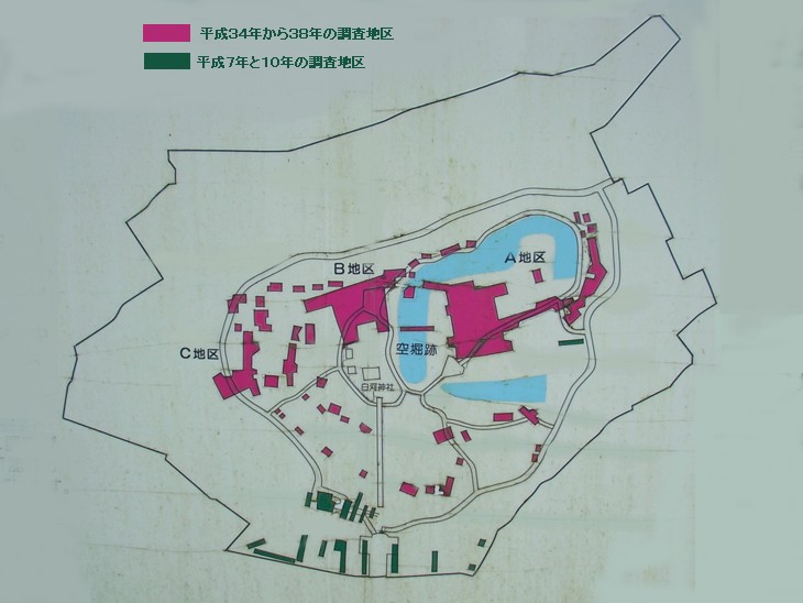 数回の発掘調査により空堀や土塁が囲むA地区からは掘立柱の建物跡や奈良〜平安時代の土器が出土した。
