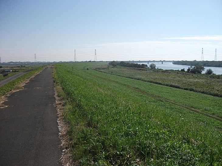 柳と椿近くの土手から既に流路も変わった下流方向を。微かに4号国道バイパスの新利根川橋が見える。