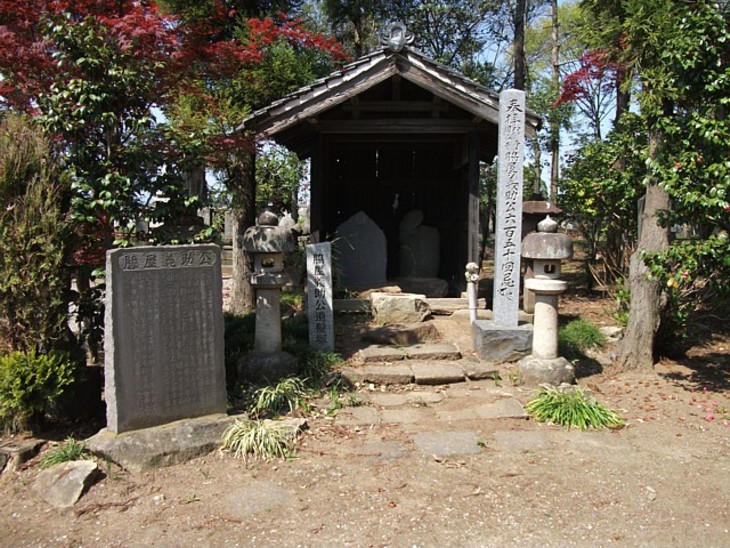 脇屋義助の遺髪を納めた遺髪塚と覆屋。児島高徳が持ち帰ったと伝わるが、詳しい経緯と真偽は不明。
