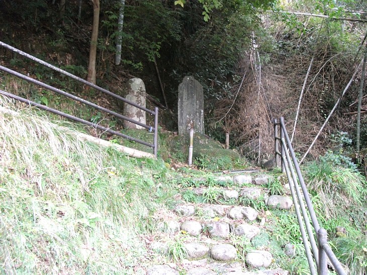 墓所のすぐ下が頼家庵跡と伝わる窪地だった。湧き水が滴り落ちる殺風景な幽閉場所だ。