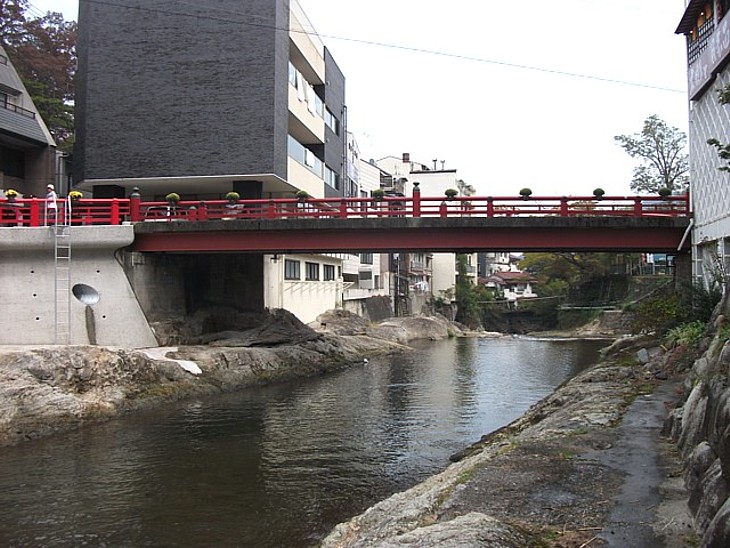 川床から下流側の渡月橋を。ここから下流は川沿いの道が途切れ、幾つもの堰堤が続く。