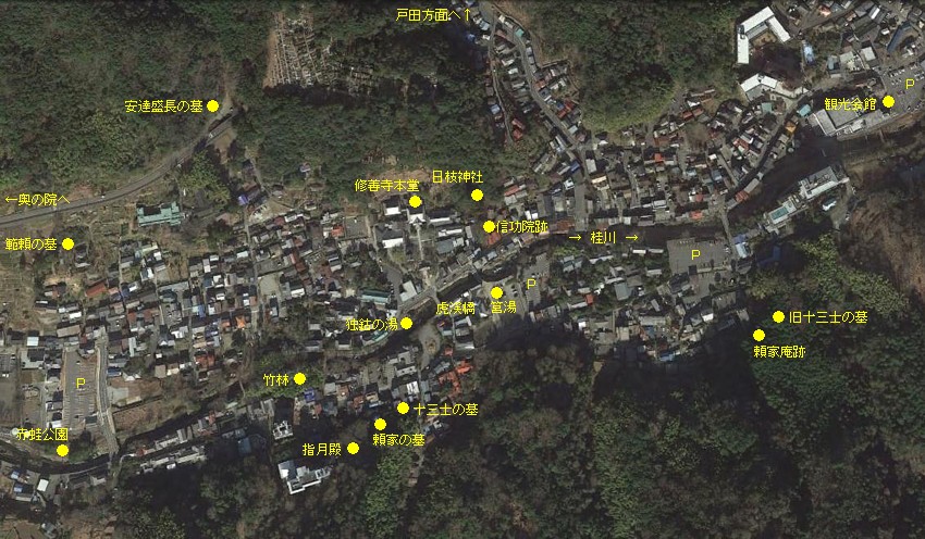 修善寺駅から狩野川を越えて修禅寺までの鳥瞰図 修禅寺周辺の鳥瞰図は
