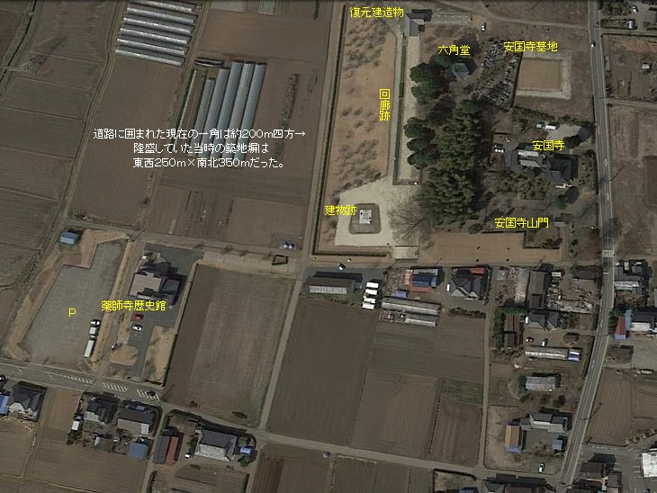 現在の道路が囲む一角は約200m四方、隆盛した当時は東西250m×南北350mだった。