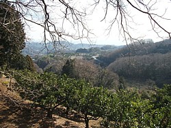 左: 六本松峠から大山道を進むと東南の二宮方面に展望が広がる。北側は梅林で南側は一面のみかん畑、遠くに相模湾が広がっている。