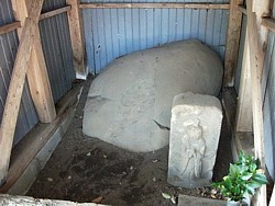 中&右: 十郎祐成 が山彦山(曽我山)の中村道を経て大磯へ帰る虎御前との別れを惜しみ腰掛けたと伝わる忍石(偲石)。また 五郎時致 は仇討から