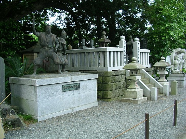 松明を掲げて討ち入る曽我兄弟の銅像と、古い石垣の上に新設された廟所。
