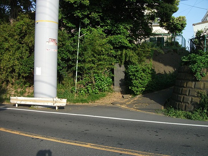 洲崎古戦場碑。やや判りにくいがモノレール橋柱の裏側、市営住宅に入る小道の横にひっそりと建っている。