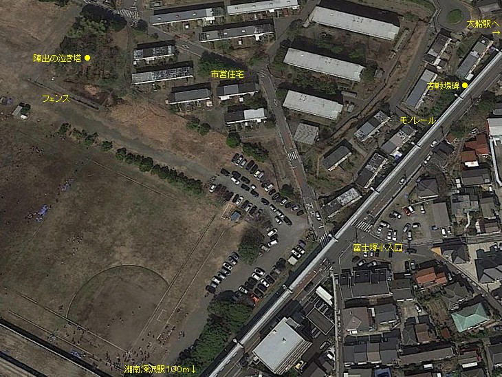 「陣出の泣き塔」には信号の横から入れるが、運動場周辺の空閑地は開発中なので状況が変わる可能性あり。