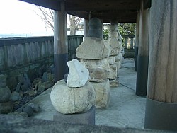 上: 廟所のスナップ。墓石はいずれも平安末期から鎌倉中期と推定される様式の五輪塔で、風化による破損が激しい。