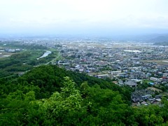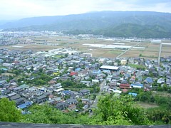 左: 北西の北江間方向。中央左の山裾が義時菩提寺の北條寺、その右奥の平地が嫡男の安千代丸が大蛇に襲われた伝承の残る大池の跡。