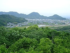 中: 南東、田中山の方向。八重姫が入水した古川の上流が見える。山並みを縫う北條道を辿れば伊豆東海岸、宇佐美から伊東荘へと下る。