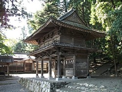 中: 総門を過ぎ、石段の途中から舞殿を見上げる。右側には別棟(控え室の機能か)に続く回廊を設けた珍しい構造を持つ。