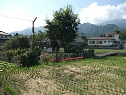 中: 釜無川の畔から願成寺の北側を抜けて武田八幡宮へ、真っ直ぐに2kmの参道が続く。中央奥は千頭星山(2139m)だろうか。
